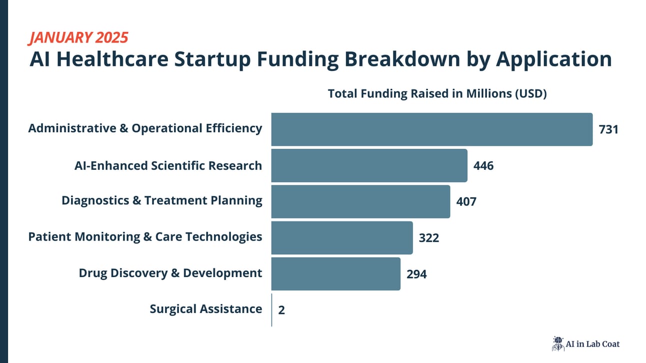 Top: Administrative & Operational AI, $731M. The healthcare system is drowning in inefficiency and investors are backing startups that automate workflows, cut paperwork and streamline processes.