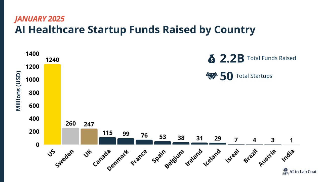 Europe came in second, with Sweden at $260M, the UK at $247M, and Denmark at $99M. These countries are continuing to attract funding, especially in AI-driven diagnostics and operational efficiency tools.