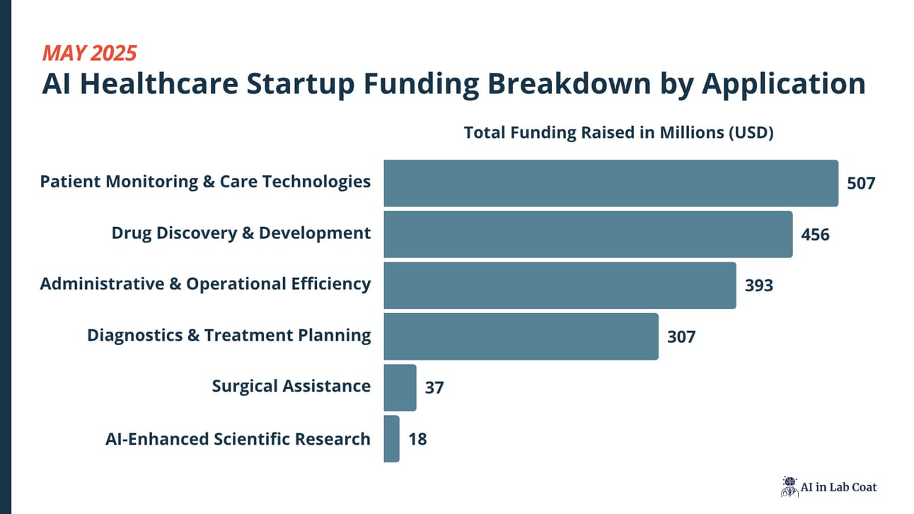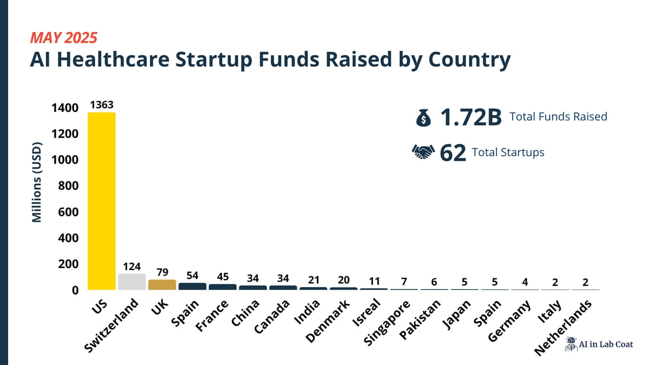 In May, AI healthcare startups secured $1.72B across 62 deals, a strong recovery from April’s $808M. A big part of that number came from an IPO by Hinge Health at $437.3M, which also made it the second-largest raise for a startup this year. Just to note, our cut-off for what we consider a startup ends at IPO. Which means, from here on out, we will not be following any funds raised with Hinge Health.